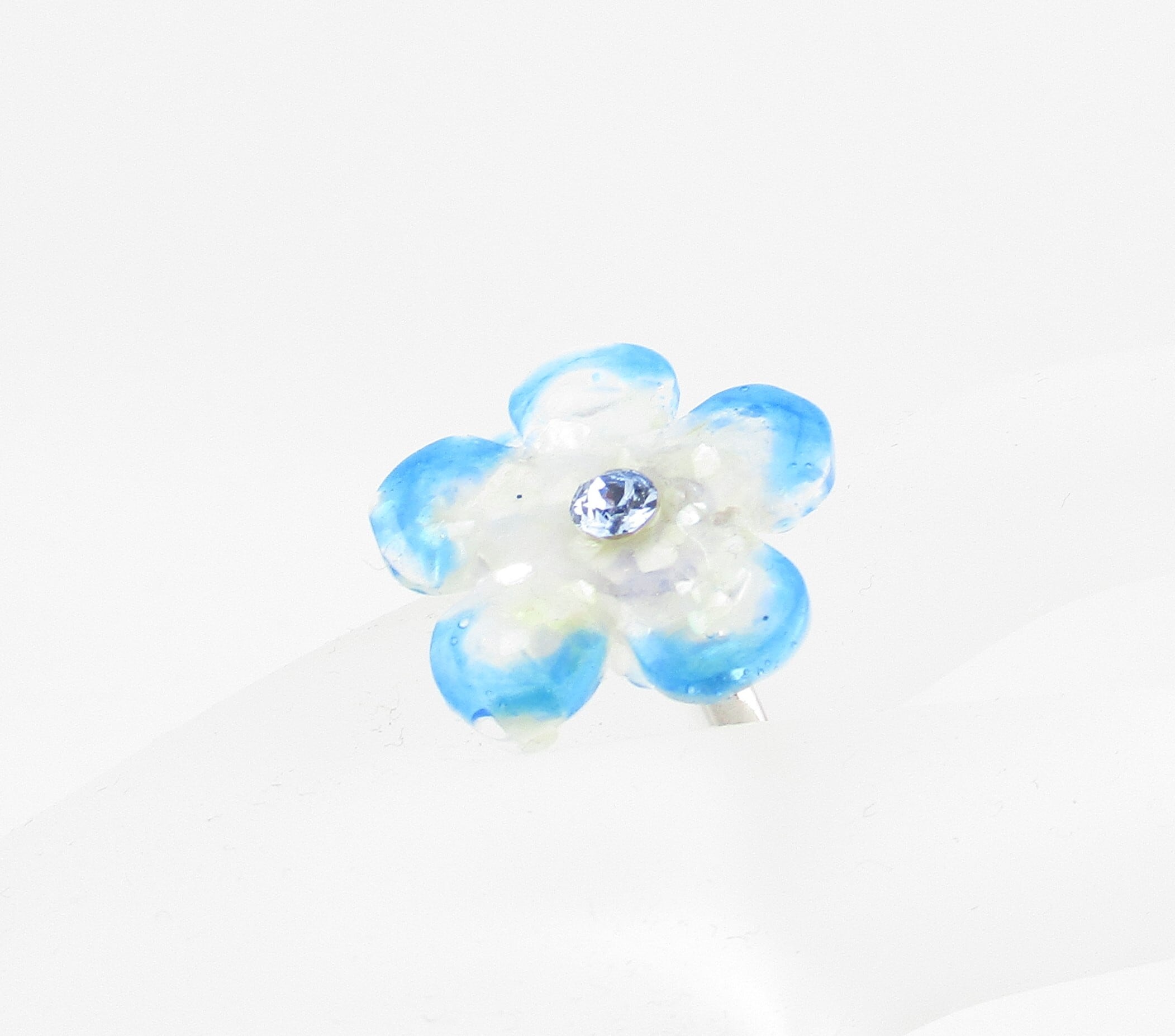 シェルやクォーツのサザレを約10mm玉の自家製レジンパーツ(フラワー型)に閉じ込めたシンプルな創作リングです。