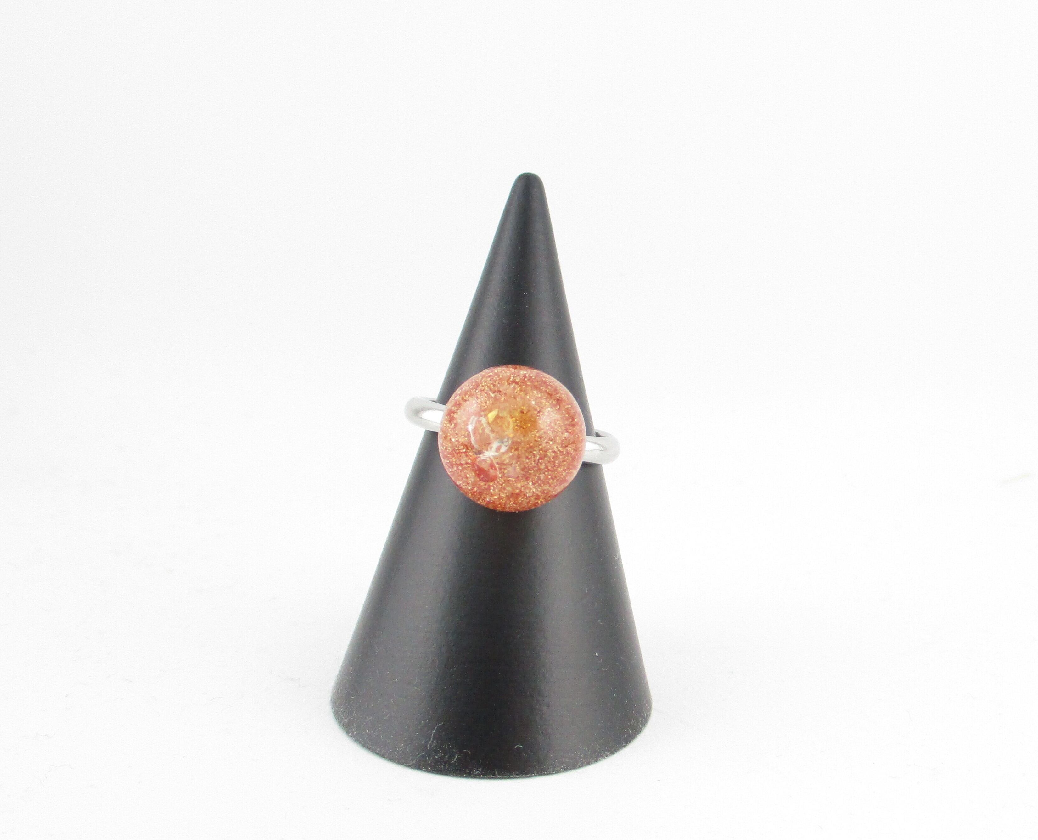グリッターやシトリンのサザレを約12mm玉の自家製レジンパーツに閉じ込めたシンプルな創作リングです。