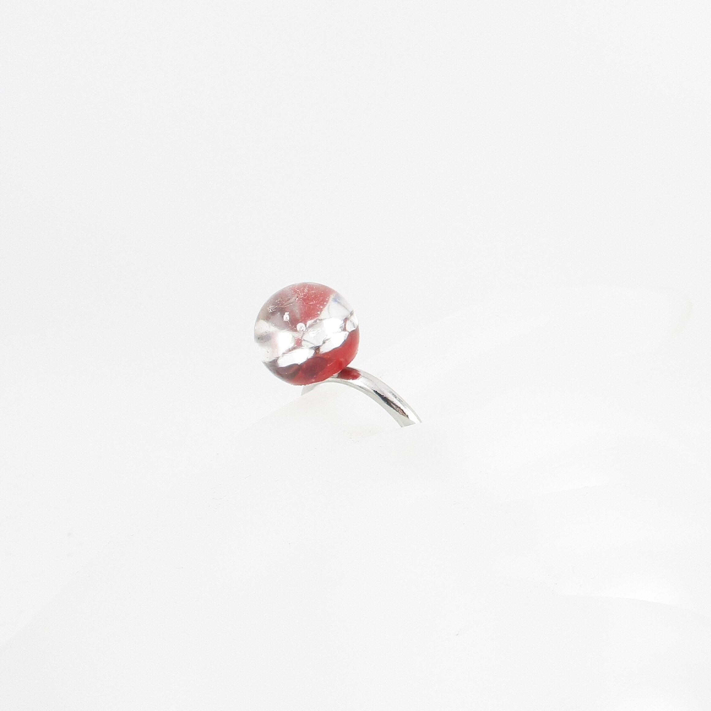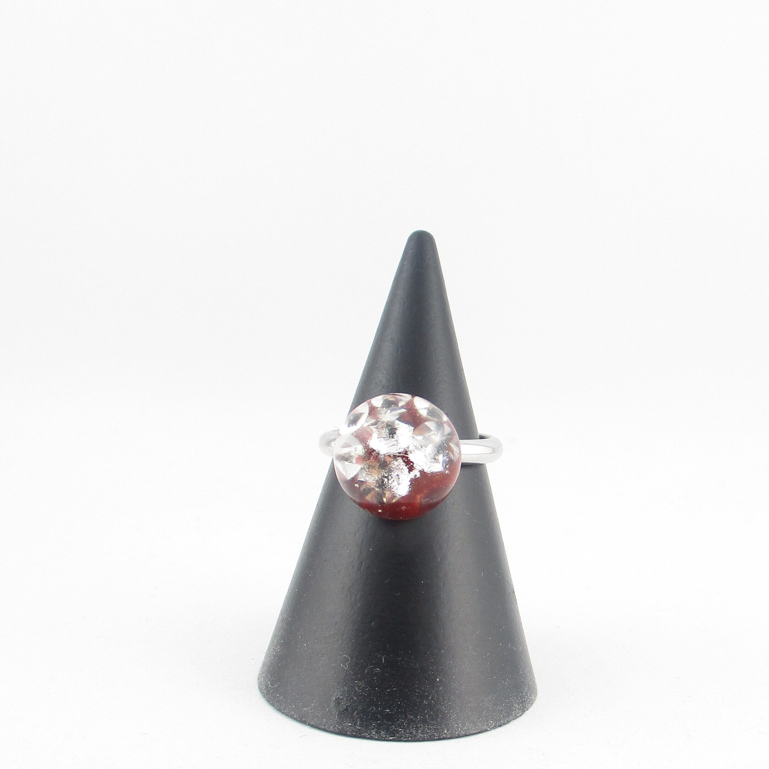 グリッターやガーネットのサザレを約12mm玉の自家製レジンパーツに閉じ込めたシンプルな創作リングです。