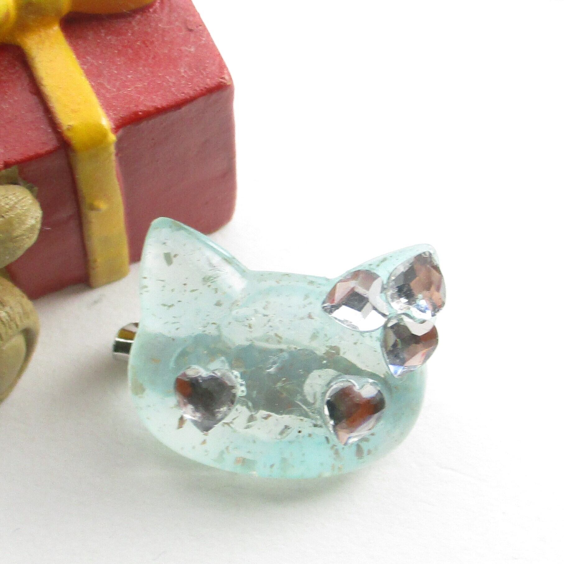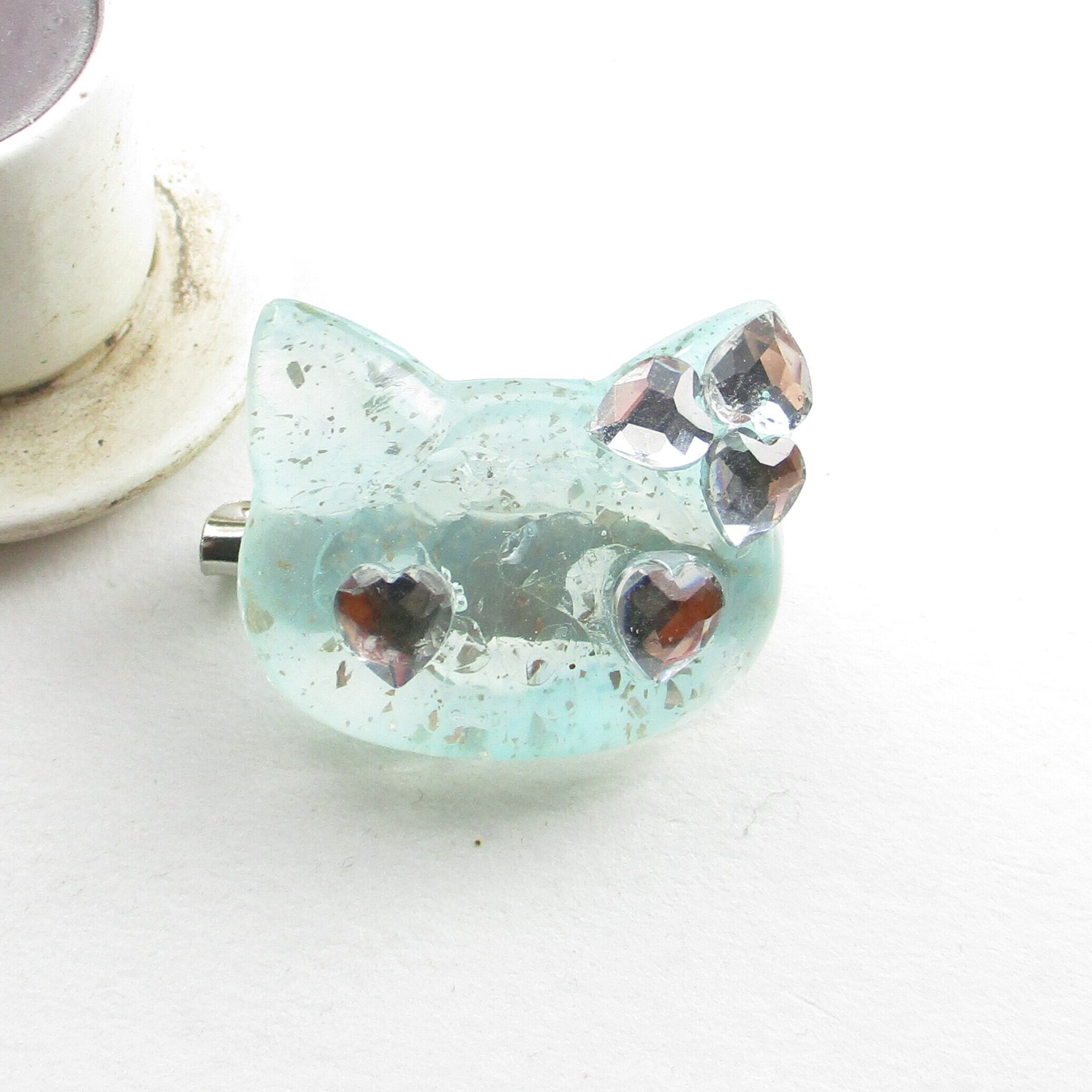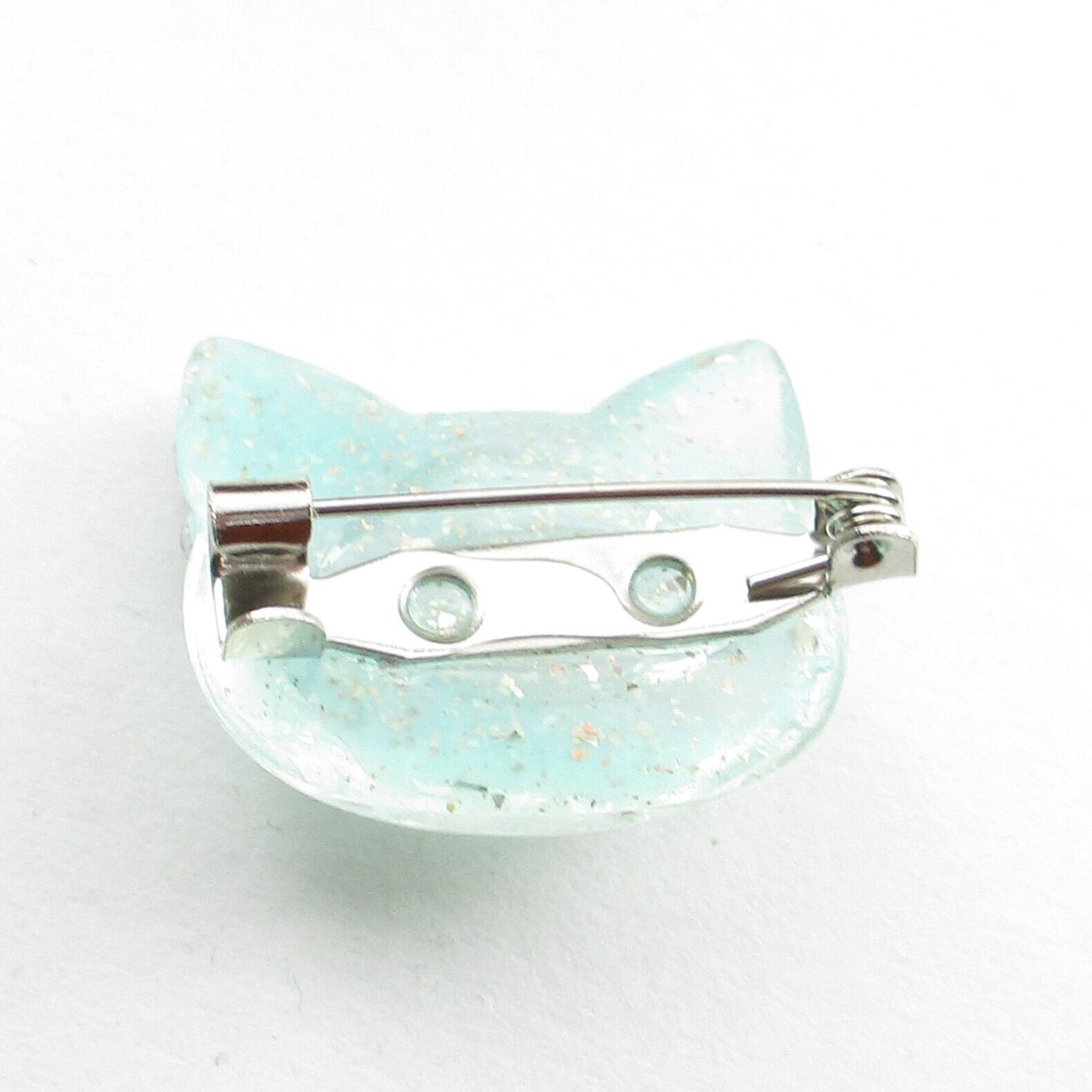 クォーツのサザレなどをネコ型のレジンパーツに閉じ込めて、そらをブローチパーツにつけて仕上げました。