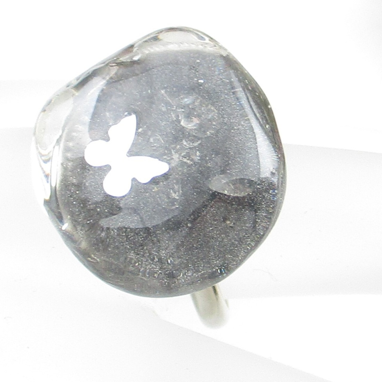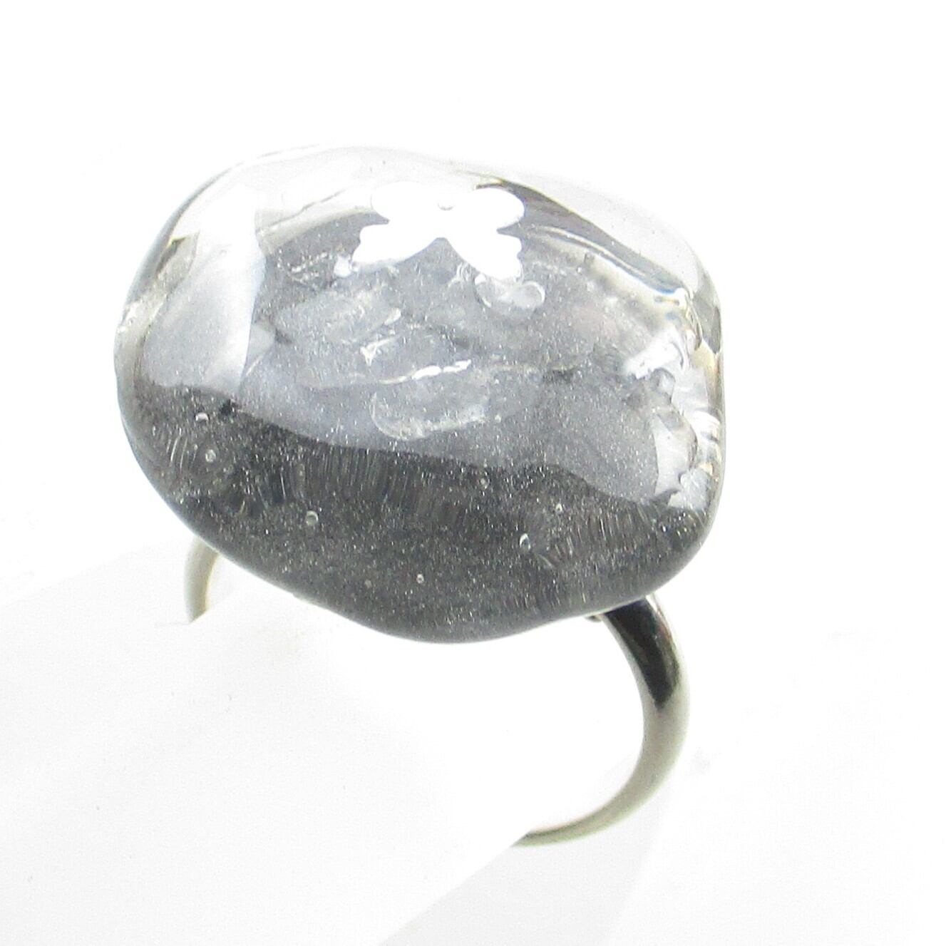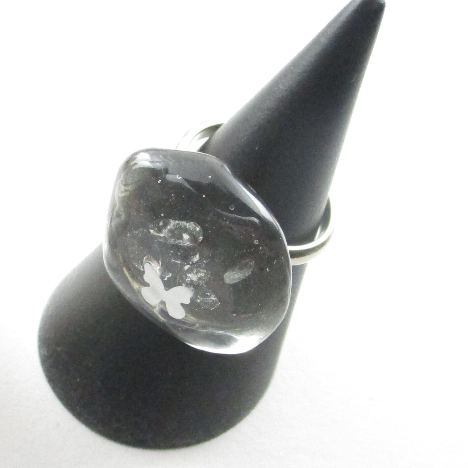 クォーツのサザレなどをラフカット型のレジンパーツに閉じ込めて、リング台にデコッた創作リングです。